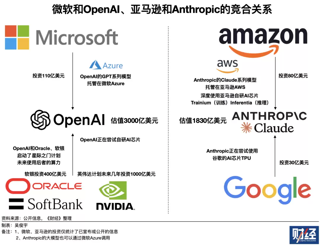 台前,是全球最大的两家AI创业公司,OpenAI和Anthropic。幕后,则是微软、亚马逊这两家科技巨头,也是全球前两大云厂商,两家长期把持着云市场60%以上的份额。