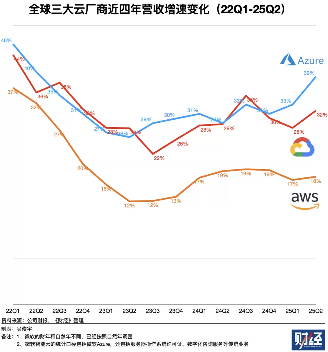 押注AI取得成功后,微软Azure真正浮出水面。微软今年7月首次披露微软Azure营收——2025财年750亿美元,同比增长34%,新增收入255亿美元。同期亚马逊AWS营收1164亿美元,同比增长18%,新增收入210亿美元。这意味着,微软Azure近一个财年新增收入超过了亚马逊AWS,两者收入差距在迅速缩小。