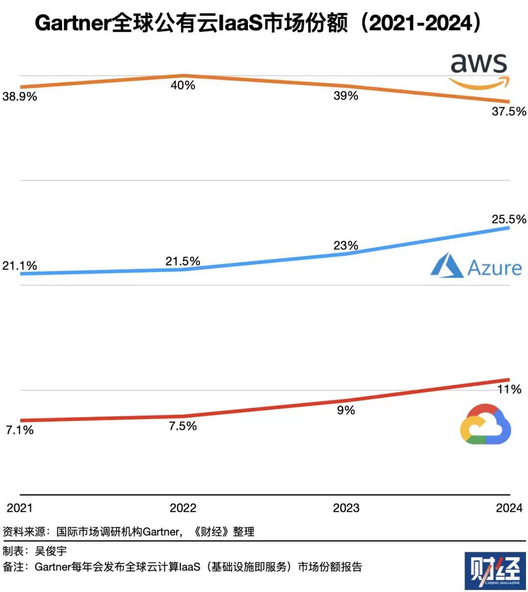 两者的市场份额差距也在缩小。国际市场调研机构Gartner数据显示,微软Azure近三年市场份额逐步提升,和亚马逊AWS的差距缩小到12%。