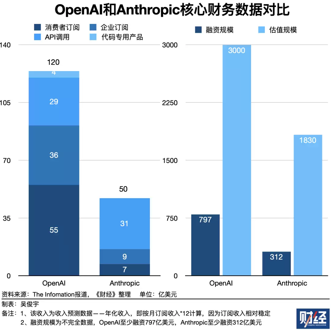 OpenAI 2015年创立,微软2019年、2024年两次出手投资。起步早让OpenAI抢到了先发优势。截至今年7月末,OpenAI年化收入约120亿美元,同比增长超过100%。截至今年8月末,Anthropic年化收入约50亿美元。
