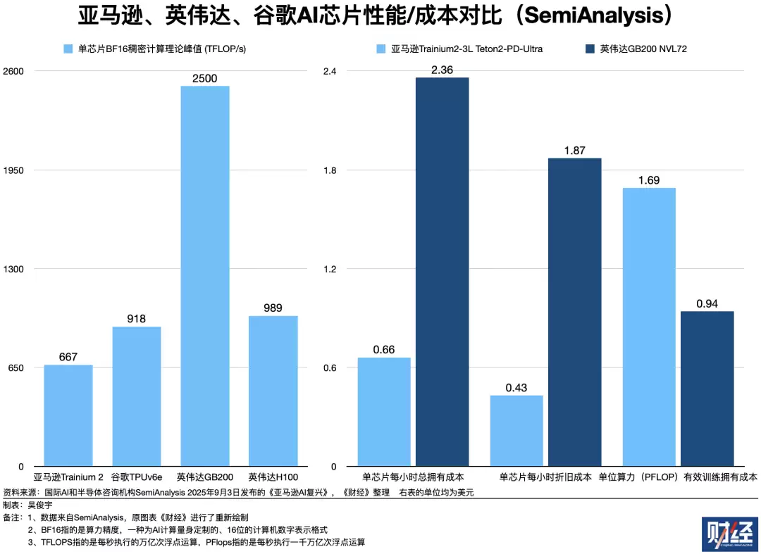 《财经》了解到,亚马逊自研芯片Trainium 2在2024年12月投入使用,下一代Trainium 3也将于今年末量产。Trainium 2设计之初对标英伟达上一代旗舰芯片H100。SemiAnalysis测算称,Trainium 2峰值性能约为H100的67%,英伟达新一代旗舰芯片GB200的26%,但单芯片每小时拥有成本仅为GB200的28%。