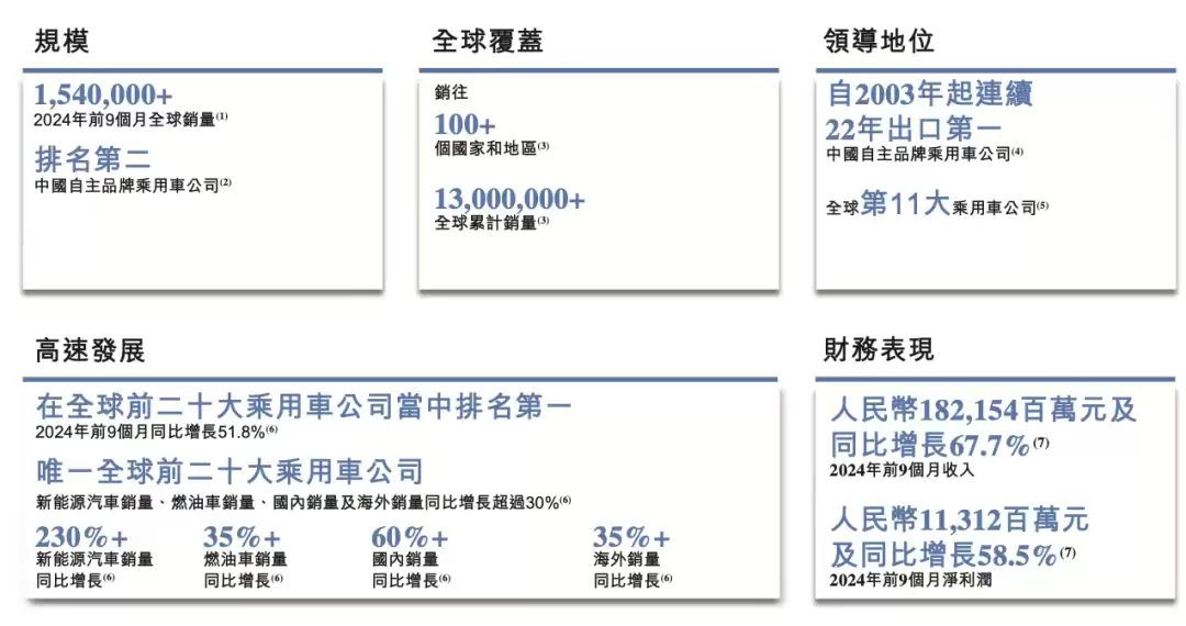 同时,招股书中还提到,在海外多个主要乘用车市场的销量中名列前茅,2024年奇瑞分别在欧洲、南美和中东及北非地区销量位列中国自主品牌乘用车公司第一,以及在北美及亚洲(中国除外)销量位列中国自主品牌乘用车公司第二。