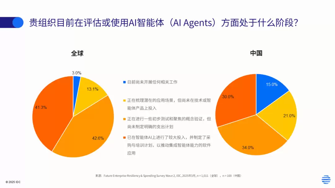 2025年7月,IDC在“报告一”中披露,中国企业AI智能体应用虽仍处于追赶全球的阶段,但其中34%受访企业开展测试验证,30%进入“较大投入+采购培训”阶段。