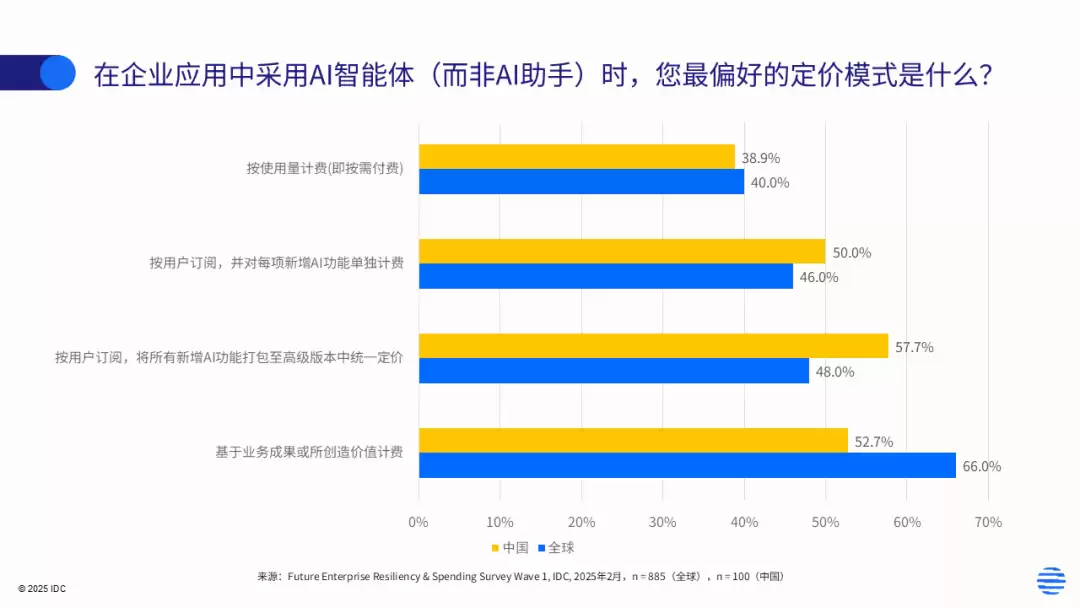 在围绕智能体商业变现与商用付费层面,IDC在“报告一”中进一步指出,中国企业表现出鲜明的付费逻辑,66%偏好“基于业务成果计费”,远超全球52.7%,推动头部厂商形成场景价值评估、POC验证、规模化扩展的一体化落地路径。