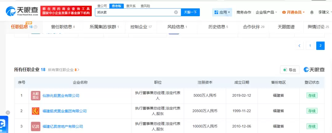 天眼查显示,郑庆昇出生于1956年,中国国籍,无境外永久居留权。在福建亿昇房地产有限公司、福建挺虎置业集团有限公司、上海阿斯顿马丁汽车销售有限公司等17家存续企业中任职。