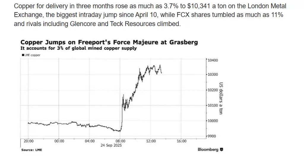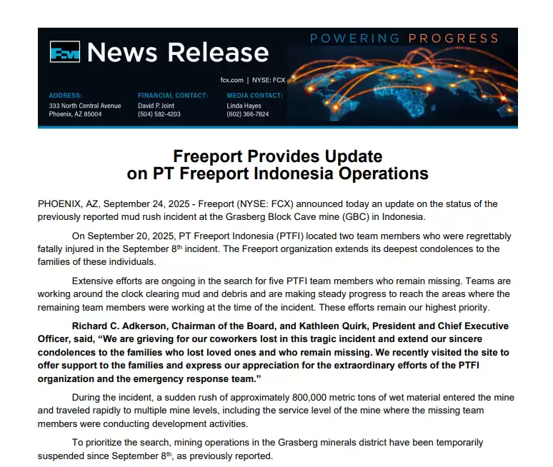华尔街见闻写道,事件的核心是Freeport位于印尼的Grasberg矿山。该公司确认,9月8日发生的一场大规模泥石流事故已造成两名工人死亡,另有五人失踪。作为应对,公司已全面暂停该矿区的生产活动,并启动了不可抗力条款,该条款允许生产商在遭遇不可预见的灾难时暂停履行供应合同。