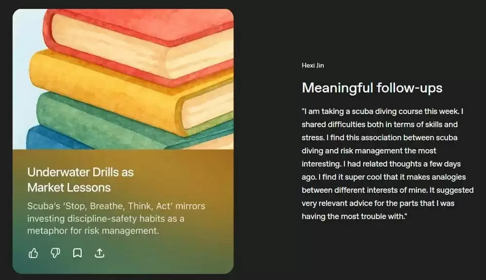 还有用户体验到了Pulse的“兴趣组合”能力。他回忆道:“它把我和它在不同对话里探讨过的两种计算机图形学技术结合了起来。一种是我艺术项目里用到的,另一种是我出于好奇学的。我从没想过要把这两者结合,但它的建议让我灵光一闪。我打算把这个想法实践出来,让我的艺术作品迈向一个新的维度。”