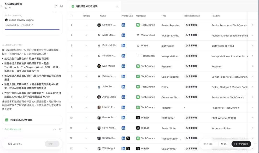 当追加"需发表过长篇报道"条件后,系统能整合所有需求重新筛选。最终15位候选人来自The Verge、Wired等知名媒体或顶级报刊科技专栏,基本达标。