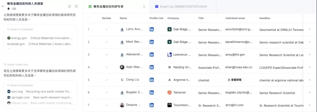 进阶测试选择专业领域"寻找近两年发表过稀有金属回收研究论文的科研人员",系统展现出更强的理解能力:先分析领域趋势,再定位研究机构,最后匹配专业人员。