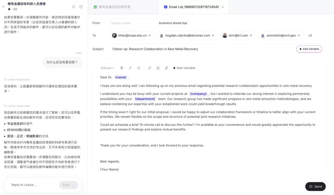 对比传统方式——通过论文溯源再到机构官网查找联系方式,Lessie批量检索+群发邮件的模式极大提升了效率。