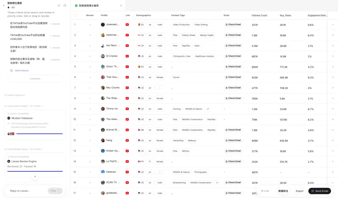 网红检索测试中,欧美区20万粉丝宠物博主检索精准,但东南亚区结果质量明显下降。