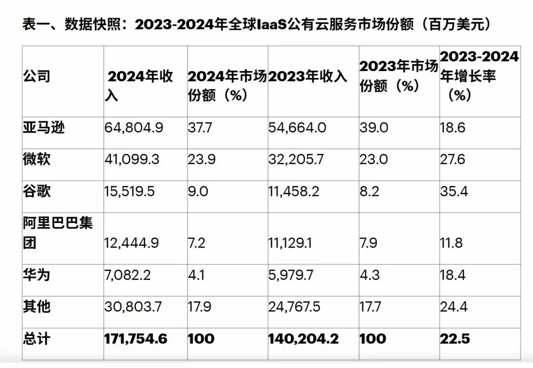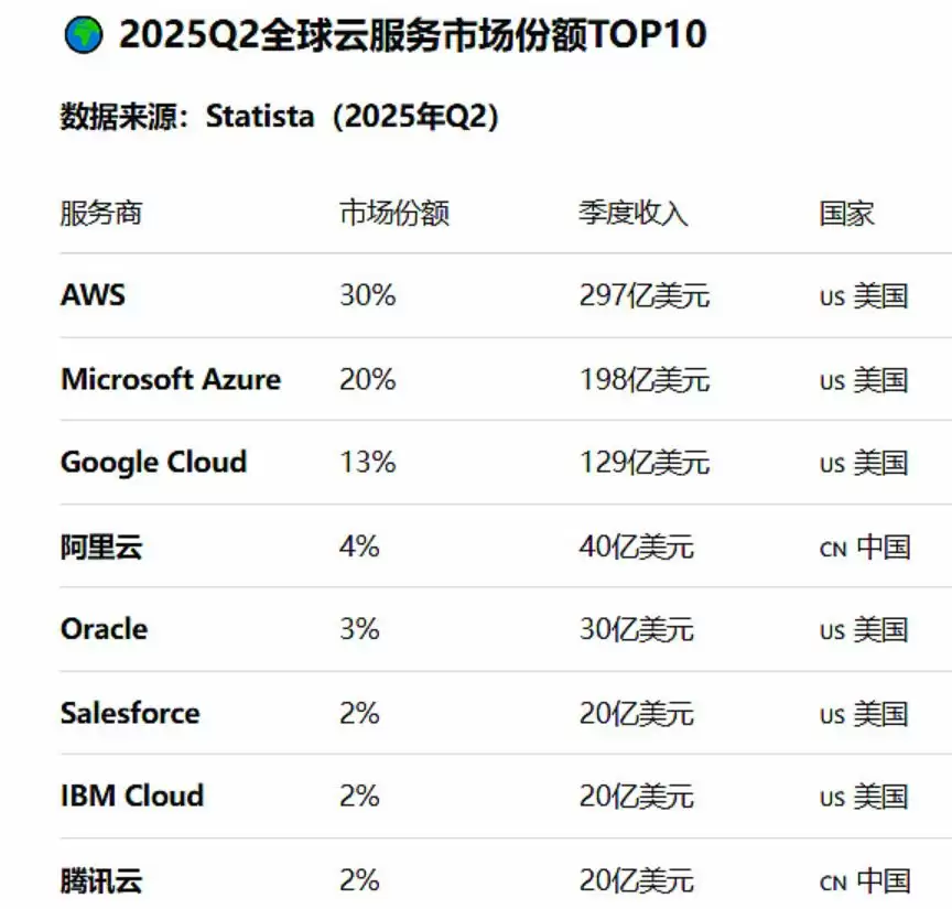 不过据Statista的数据(见表),2025年Q2全球云服务市场份额TOP10厂家分别为亚马逊的AWS、微软Azure、谷歌云、阿里云、甲骨文等,季度营收分别为297亿美元、198亿美元、129亿美元、40亿美元、30亿美元,市场份额分别为30%、20%、13%、4%、3%。阿里云2025年Q2营收仅为亚马逊AWS的13.4%、微软Azure的20.2%、谷歌云的31%,跟甲骨文云比营收相差仅10亿美元,市场份额差1%。显然,阿里云跟全球云计算TOP3大厂的市场份额距离有点大——与AWS差26%、与Azure差16%、与谷歌云差9%。而甲骨文云、IBM云、腾讯云等追兵又追得很紧。阿里云可谓腹背受敌。