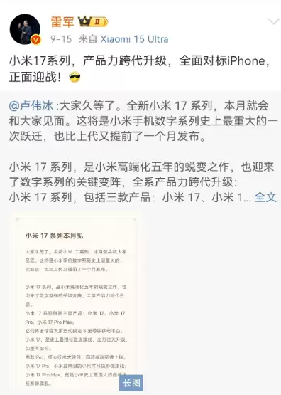 苹果发布会当天,小米总裁卢伟冰在社交平台不吝赞美之词;五天后却突然下战书。雷军更是直言小米17系列将全面迎战iPhone,火药味十足。