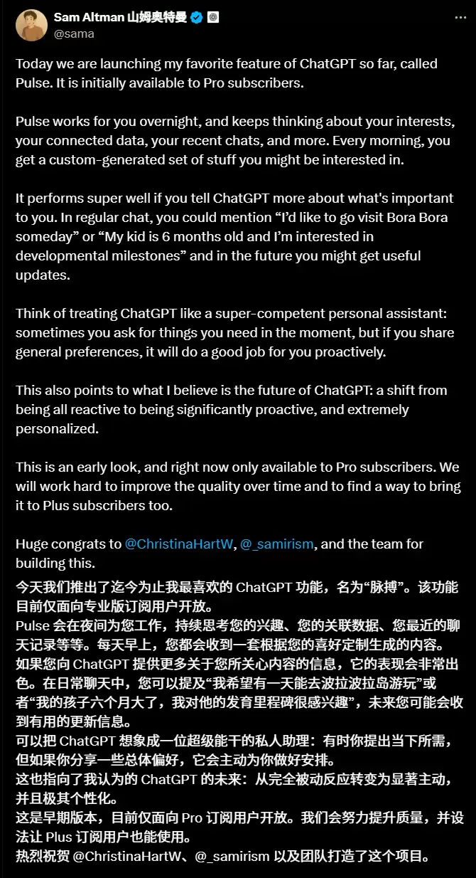 ChatGPT Pulse上线,人人都可享AI私人秘书