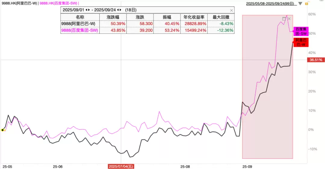 资本市场对此反应积极。除了多家投行上调阿里、百度等国内科技巨头的估值外,华尔街明星基金经理“木头姐”更是四年来首次买入阿里巴巴。股票表现上,自8月底以来,百度和阿里巴巴的港股股价累计涨幅均在50%左右。