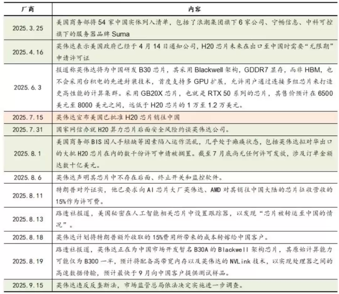 今年4月,美国政府一度禁止英伟达向中国销售H20芯片,尽管7月恢复出口,却附加了15%的收入上缴条件。面对美国的限制,中国的反制也接连升级:7月底H20被曝“漏洞后门”遭到约谈,8月中旬一度传出停产消息,而近期的反倾销调查更是将这场风波推向高潮。