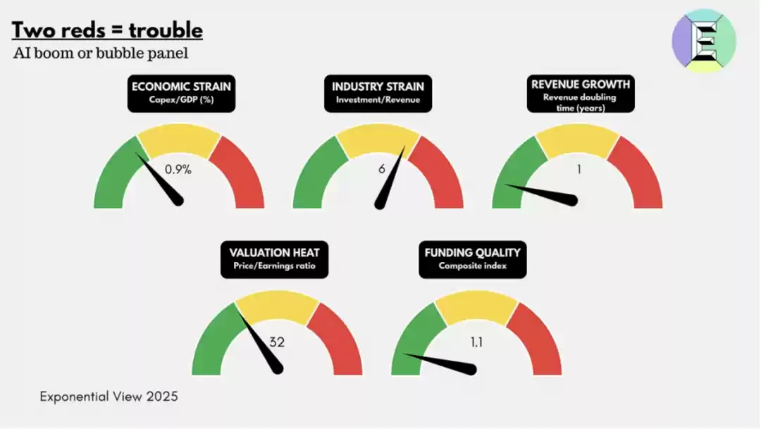 作者用五个仪表盘来实时观察AI投资的水温,结论是尚未进入泡沫,但要重点警惕GPU的快速折旧问题,以及未来数据中心的融资结构/资金质量问题。。