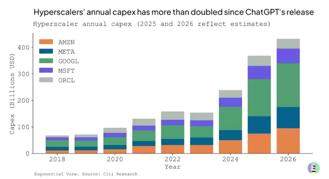 就AI基础设施而言,其中大部分支出表现为资本支出:服务器、冷却系统、网络设备、钢筋水泥建造的机房,以及维持其运转所需的供电设施等。