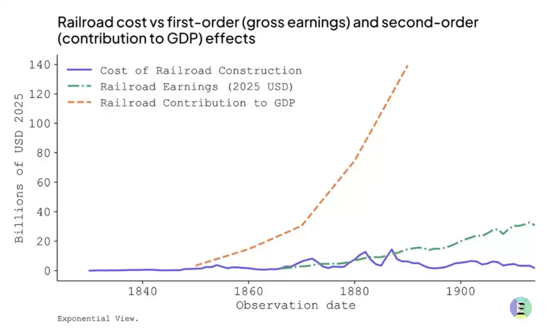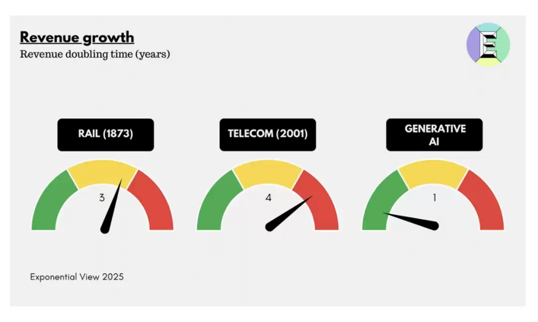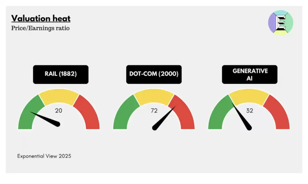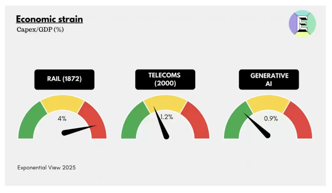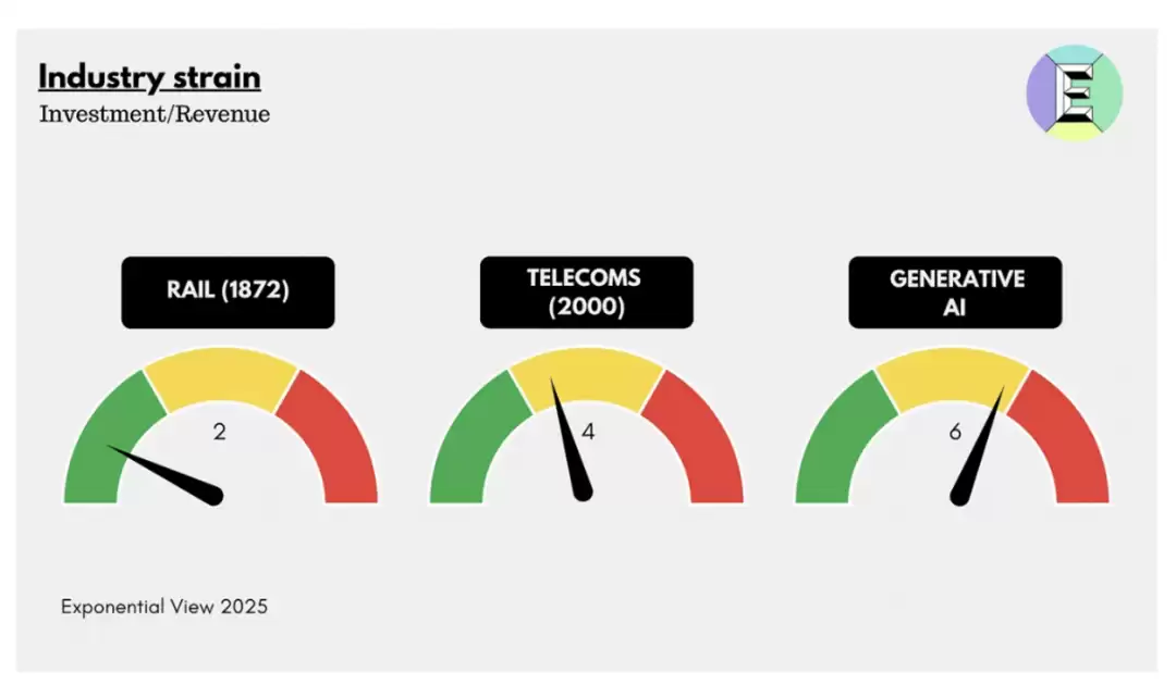 AI是否泡沫,或者说是否会进入泡沫?这将是未来多年一直会被讨论的话题。科技创业者、作家Azeem Azhar提供了一个很好的框架,用来对比历史上两次巨大的基础设施投资泡沫:铁路、电信和互联网。