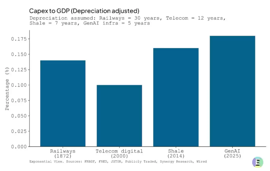 1872年美国铁路扩张达到高峰时,资本支出约为当年营收的两倍。1990年代末电信泡沫中,这个比率涨到了将近四倍。而相比之下,如今的genAI热潮是用约600亿美元的年收入来支撑全球约3,700亿美元的数据中心资本支出,比率高达6倍,是上述三者中压力最大的。