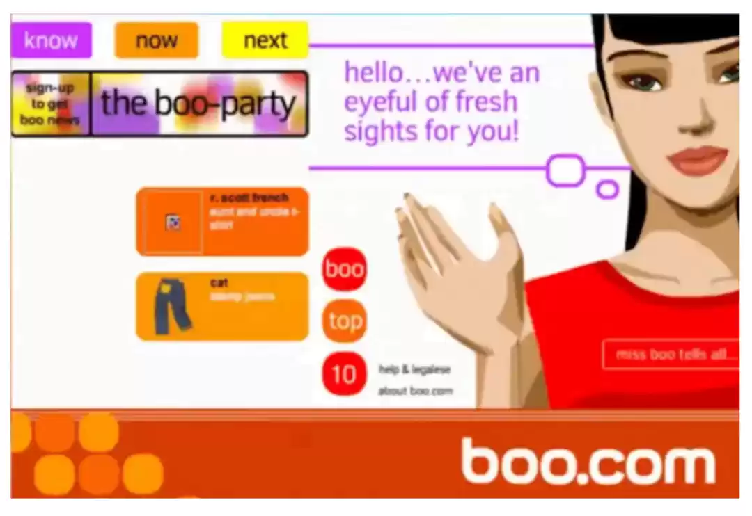 这家公司在上线前就砸下2,500万美元做广告,员工从40人暴涨到400人,并在纽约和欧洲开设了豪华办公室。他们的 大量使用JavaScript和Flash,在拨号上网环境下几乎无法使用,还与Mac电脑不兼容且漏洞百出。每四次尝试购买就有一次失败。尽管公司极尽铺张,调查却显示只有13%的互联网用户知道这个品牌。不到18个月,资金耗尽。2000年5月,Boo.com宣告倒闭。