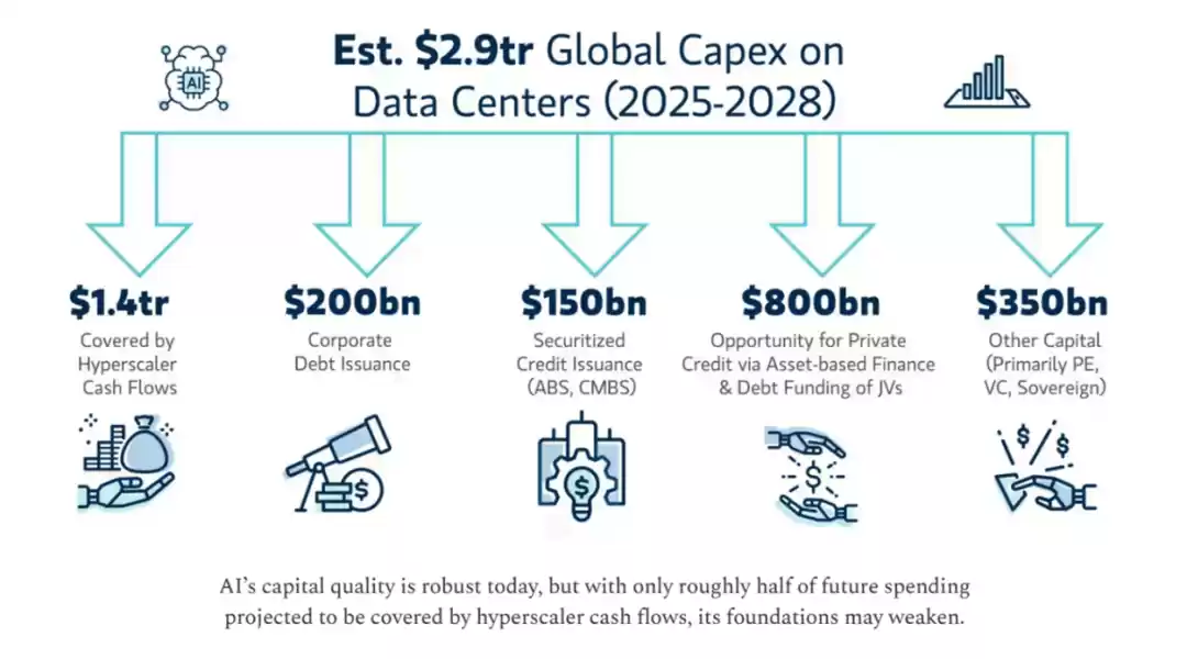 在这方面,如今的AI热潮看起来更稳健。微软、亚马逊、谷歌母公司Alphabet、Meta和英伟达都在赚取海量现金流,轻松就能自筹资金来建设自己的版图——目前是如此。但投资需求正迅猛提升。摩根士丹利估计,2025到2028年全球数据中心资本支出总额将达到2.9万亿美元。超大规模厂商或许能用自身现金覆盖其中的一半,剩下的必须来自私募信贷、证券化融资以及新进入者。各国政府也承诺了1.6万亿美元的主权AI投资,中东产油国资本也在寻求新的机会。
