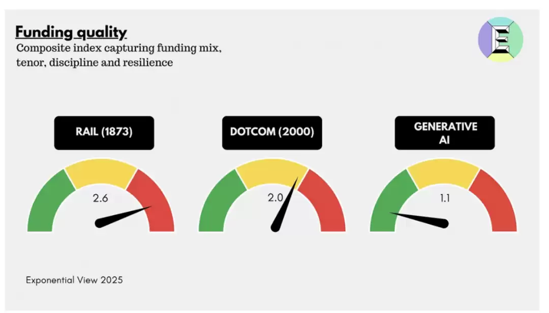 在这些案例中,支撑繁荣的资本最终都被证明是易碎的。但脆弱程度各不相同。铁路和电信泡沫最易受信贷紧缩冲击,债务率急剧膨胀;而互联网泡沫下,公司更多是受市场情绪摆布——股价蒸发殆尽。