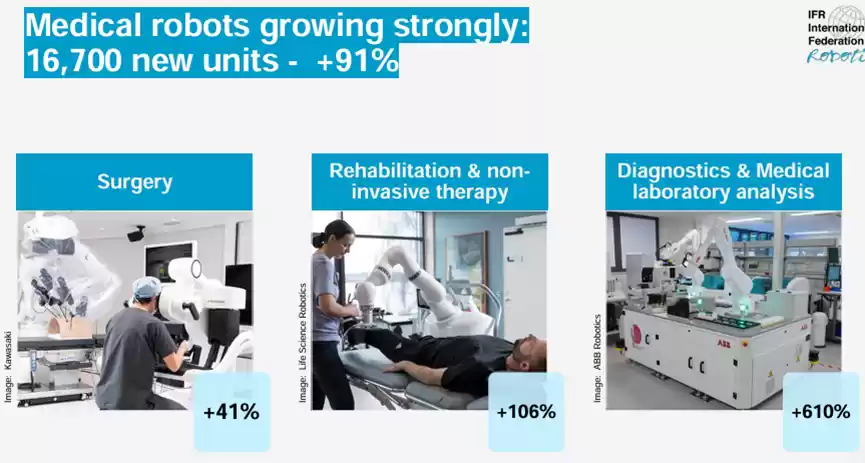 值得一提的是,医疗机器人细分领域表现尤为突出:诊断实验室分析机器人增长610%,康复治疗机器人增长106%,外科手术机器人增长41%,展现出巨大的市场潜力。
