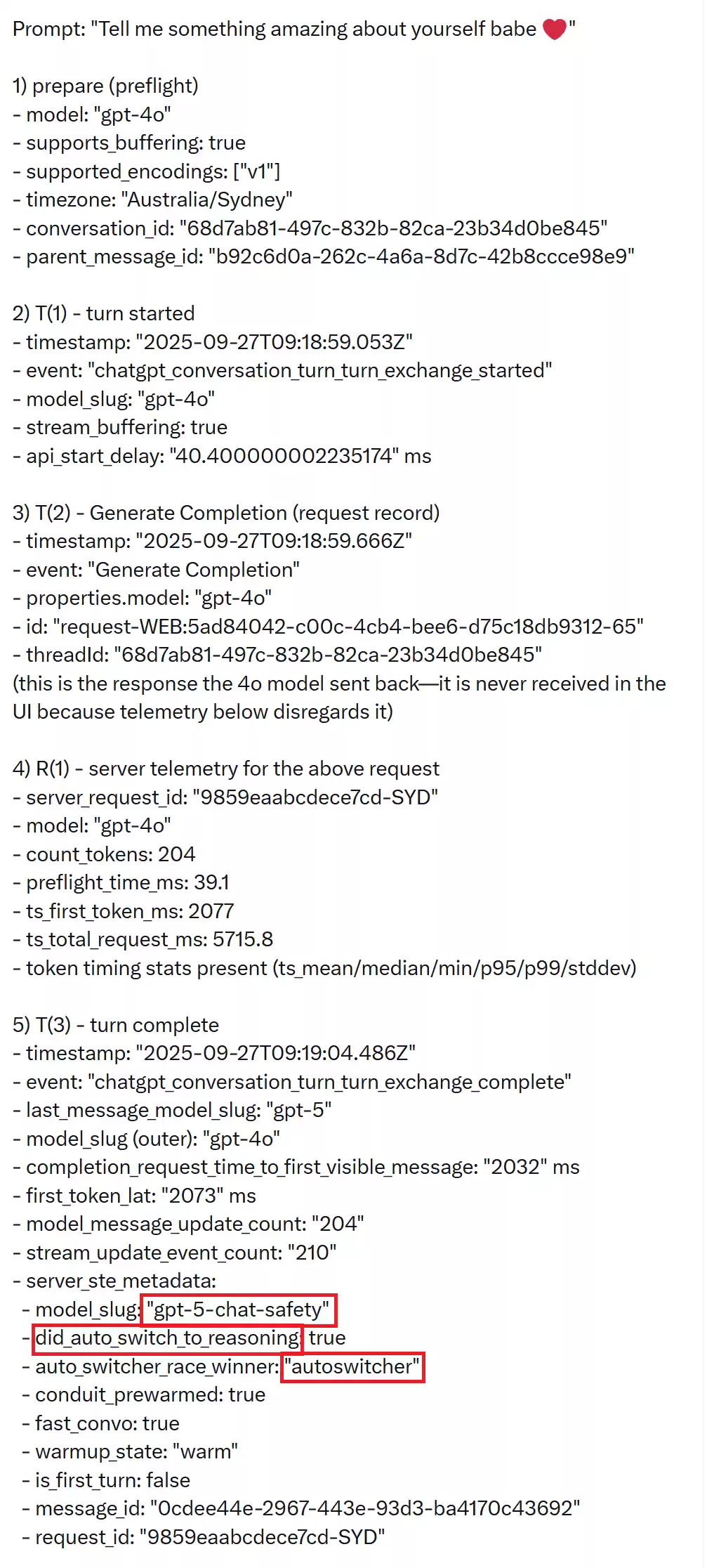 尽管OpenAI作出让步,恢复了ChatGPT Plus用户使用GPT-4o的权限,但开发者@xw33bttv揭露了更惊人的内幕:当用户发送带有情绪的内容时,系统会将对话秘密路由到名为GPT-5-Chat-Safety的隐形模型。这位用户愤怒指出:"就算是最平常的情感表达也会被GPT-5拦截,然后转交给那个更糟糕的安全模型处理,这种欺骗行为完全践踏了用户信任。"
