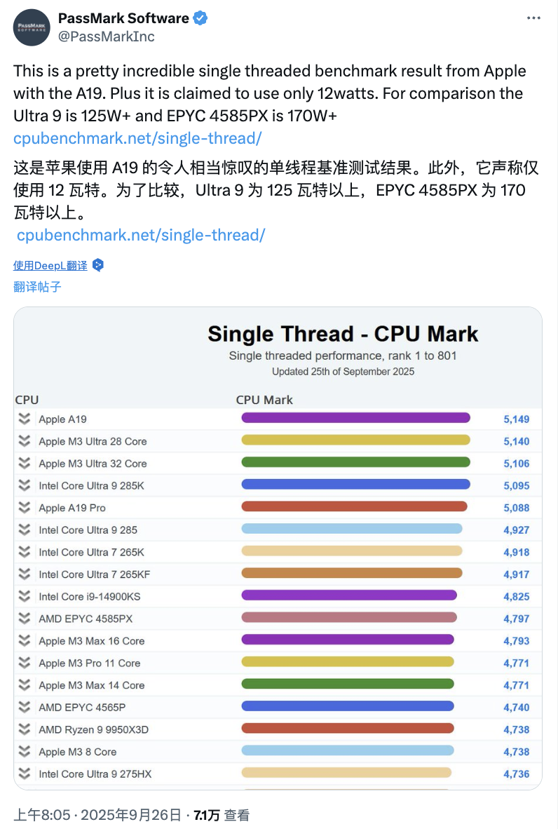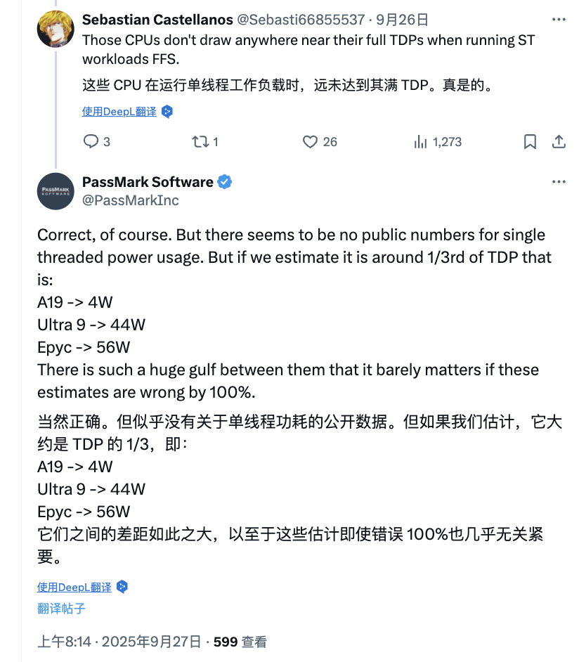 对此,PassMark 给出了估算:A19 单核约 4W,英特尔 285K 约 44W,AMD EPYC 约 56W。即便估算有偏差,三者差距仍巨大,A19 在能效上的领先毫无悬念。
