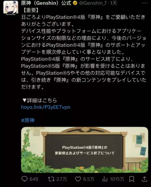 今年8月,米哈游宣布将在未来的版本中逐步停止对PS4 平台的《原神》支持与更新。消息一出,立刻引爆日本玩家社群,相关词条登上日本X(原Twitter)热搜第11名,相关内容播放量在短时间内突破1000万。