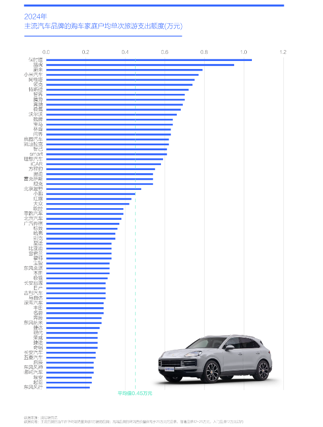 2024年,中国购车家庭的户均单次旅游支出额度为0.45万元,内部差异同样显著。其中,高端品牌的户均单次旅游支出额度高达0.65万元,普通品牌则大幅降至0.35万元,入门品牌甚至不及0.3万元。
