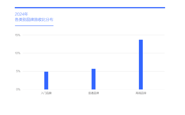 2024年,中国购车家庭的户均“旅收比”为8.93%,同样呈现出严重的分化态势。其中,高端品牌的户均“旅收比”高达13.68%,普通品牌则大幅降至5.68%,入门品牌更是低于5%。整体来看,呈现出收入越高,购车家庭旅游支出占比越高的特征。