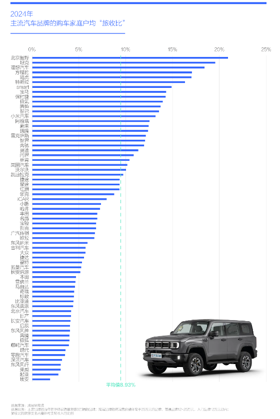 从“旅收比”看,北京越野用户最懂得及时行乐,位居2024年榜首,大盘户均8.93%,多数品牌不足6%,高端品牌高达13.68%