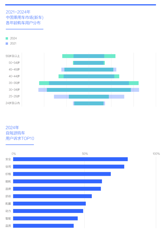 2017-2019年,随着再购占比的增多,中国车市逐渐催生出自驾游这一新兴趋势,彼时因自驾游而产生的购车需求突破了30%。但2020年突如其来的新冠疫情彻底压制了该演变势头,2024年小幅修复,疫情最后一年的2024年,自驾游诉求追平了上下班,2024年,长久以来被压抑的自驾游热情如火山喷发般迅速释放,自驾游的购车诉求占比逼近50%,并且大幅超越了上下班通勤的购车诉求。到了2024年,自驾游的购车诉求超过50%,进一步稳固了其领先地位。