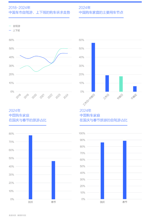 疫情后中国购车用户的自驾游欲望愈发强烈,使得节假日旅游更易滋生出自驾游。2024年,中国购车家庭在国庆期间的旅游占比高达77.71%,其中,有86.17%的旅游家庭选择了自驾游;春节期间的旅游占比相较于国庆有所减少,降至46.47%,但其中选择自驾游的旅游家庭占比却高达88.65%,比国庆期间还略高一些。