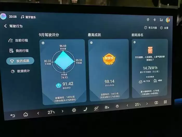 谈及自驾游,新能源汽车的能耗支出优势,可是相当明显。“我新入手的某自主品牌中型SUV,工作日在城市道路与高架路混合路况中,往返七八十公里。在动能回收设置为‘标准’模式下,其百公里电耗稳定在约14kW·h.”