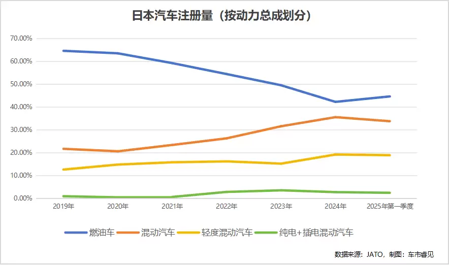 日本乘用车市场正经历深刻变革,内燃机车型的份额持续萎缩。2024年,内燃机车型占乘用车总注册量的份额首次跌破50%,2024年进一步降至42.3%,尽管2025年上半年小幅回升至44.7%,但市场的主体已被电动化动力总成占据。