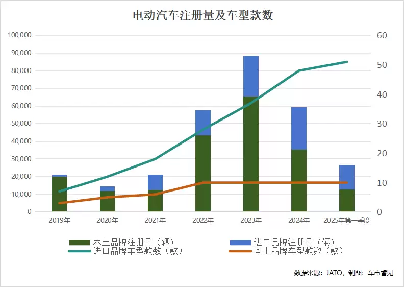 日本的纯电动汽车则进展缓慢,2019年其市场份额仅为0.5%,2024年爬升至2.2%后,2025年上半年又回落至1.3%,市场渗透速度依然有限。在售车型从2019年的10款大幅增加至2025年的61款。然而,其中仅有10款来自日本品牌,其余51款为外国品牌,凸显了进口车在日本纯电动汽车市场的的强势影响力。销量层面,2024年日产和三菱陆续推出的轻型纯电车型,推动日本品牌纯电车型的市场份额逐步提升。轻型纯电动汽车价格实惠、尺寸紧凑,非常符合当地喜好,能够吸引当地消费者,已成为近年来采用纯电动汽车的实用起点。