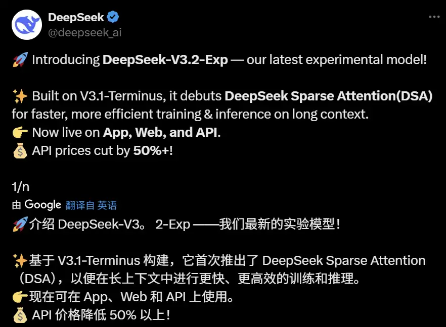 重点要说的是,DeepSeek 称该实验版本代表了他们对更高效的 Transformer 架构的持续研究,特别注重提高处理扩展文本序列时的计算效率。