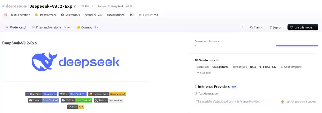 该模型参数量为 685B,HuggingFace 链接:https://huggingface.co/deepseek-ai/DeepSeek-V3.2-Exp