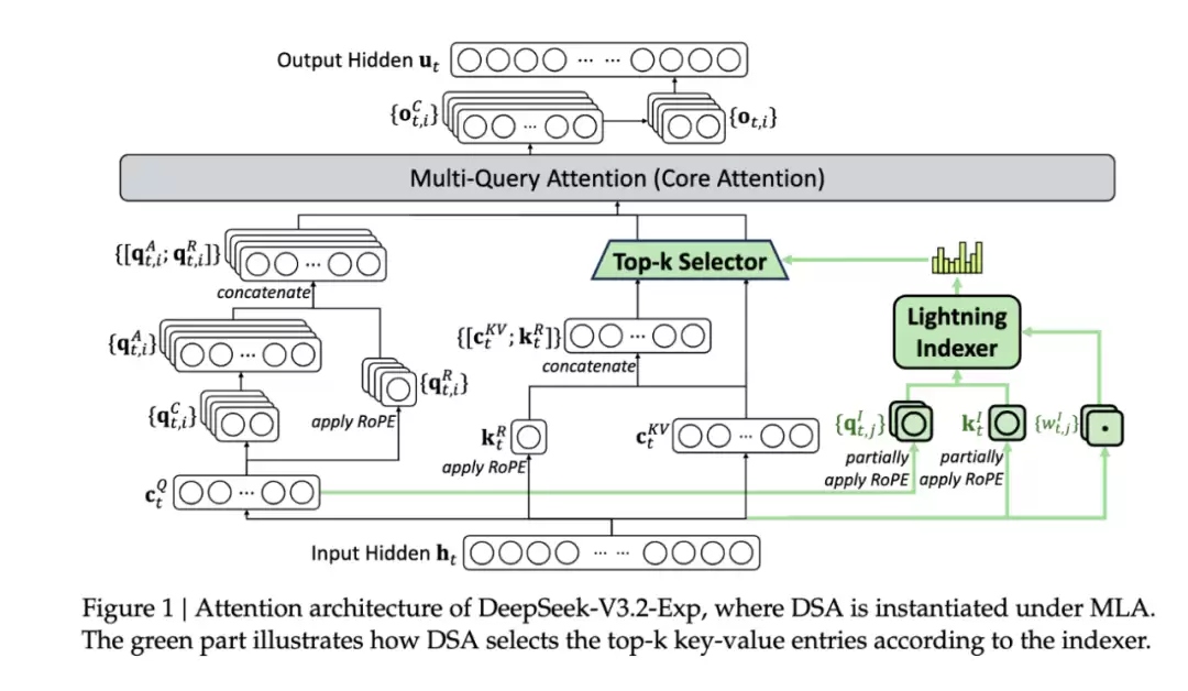 DeepSeek-V3.2-Exp 的架构,其中 DSA 在 MLA 下实例化。