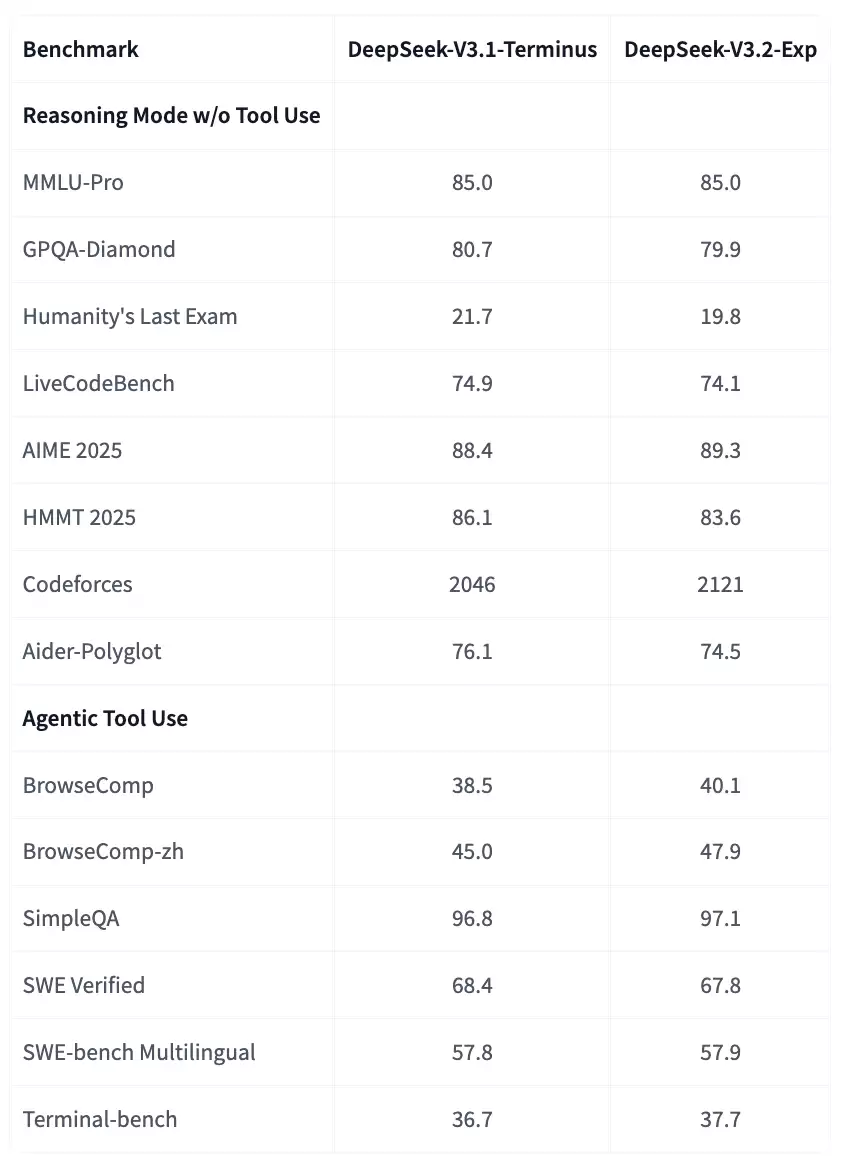 为了严格评估引入稀疏注意力机制的影响,DeepSeek 特意将 DeepSeek-V3.2-Exp 的训练配置与 9 月 22 日刚刚推出的 V3.1-Terminus 进行了对比。在各个领域的公开基准测试中,DeepSeek-V3.2-Exp 的表现与 V3.1-Terminus 相当。