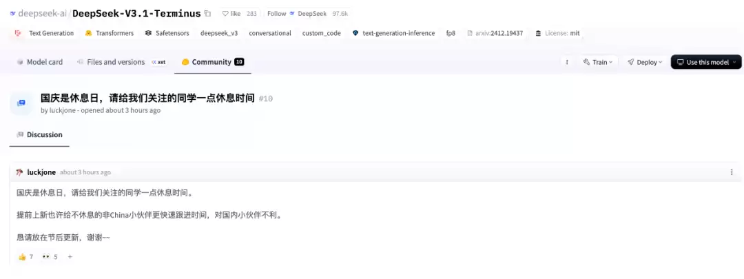 最后,有一波小节奏。在模型发布前,已经有网友在 Community 里发帖称:国庆是休息日,请给我们关注的同学一点休息时间。