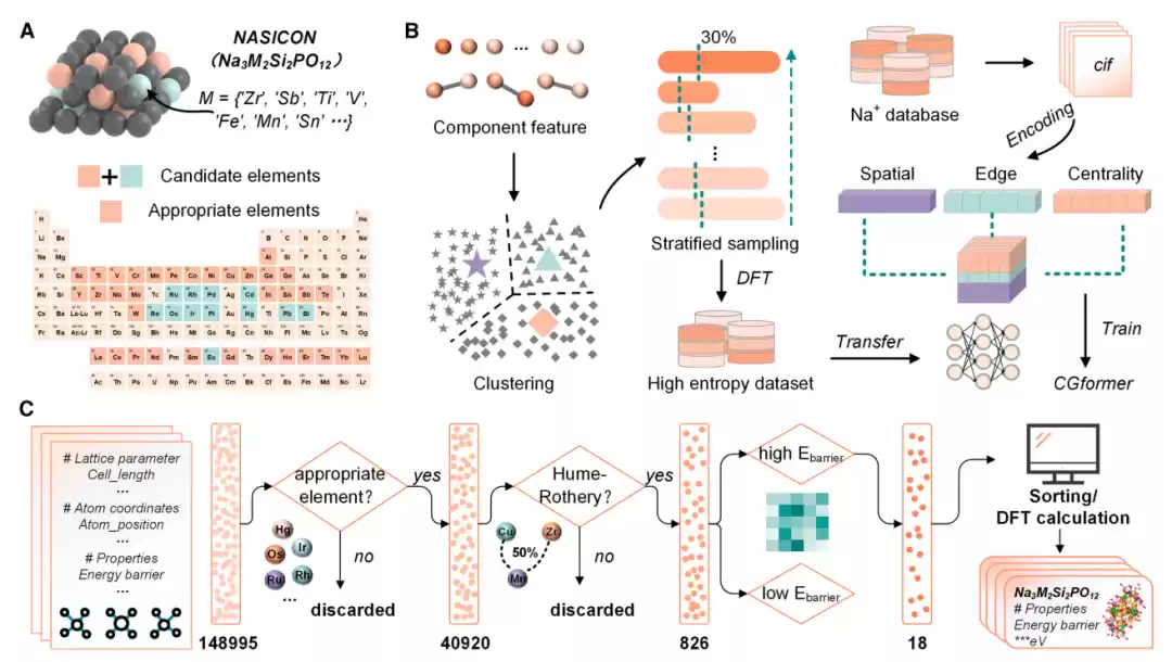HE-NSEs 计算数据集:以 Na₃Zr₂Si₂PO₁₂ 为基础(如上图所示),在 Zr 位点考虑 45 种潜在高熵掺杂元素,初步形成包含 148,995 种可能的高熵结构的初始化学空间。之后通过多轮筛选,包括排除不适宜元素(放射性、高毒性及昂贵元素)、约束原子半径差异与电荷平衡等,进一步将化学空间缩小至 826 种相对稳定的结构。接着再通过无监督层次聚类将其分为 20 组,从每组分层采样 30% 的结构(共 238 种),经密度泛函理论(DFT)计算得到其 Eb 值,最终形成用于微调 CGformer 的专用数据集,以便模型专门适配高熵 NASICON 结构中钠离子 Eb 的预测任务,提升模型在目标场景下的精度。