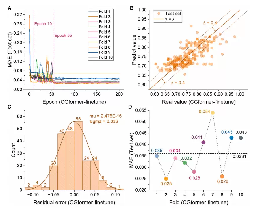 在微调阶段(如下图所示),预训练后的 CGformer 在 200 轮微调中,10 轮左右 MAE 即显著下降,最终 10 折交叉验证平均 MAE 仅为 0.0361;微调后预测值与真实值偏差进一步缩小,残差主要集中在 -0.05 到 0.05 范围内,且呈良好正态分布,证明其对高熵体系 Eb 的预测具有极高精度,体现了其数据缺失场景下的应用潜力。