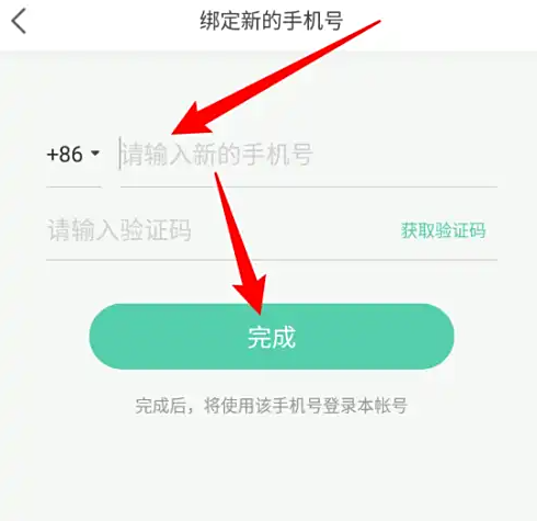 填写需要绑定的新手机号码并输入验证码,最后点击完成按钮确认