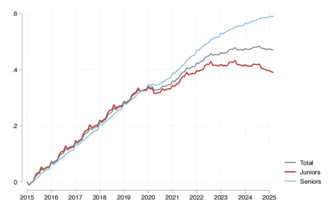 2015到2024年,初级岗位和高级岗位的就业曲线基本是手拉手往上走的,挺和谐。可到了2024年中,风向突变:高级岗位继续昂首挺进,初级岗位却停滞甚至掉头往下,两条线直接剪刀差开。偏偏这个时间点,正好撞上ChatGPT的发布,完美重合。