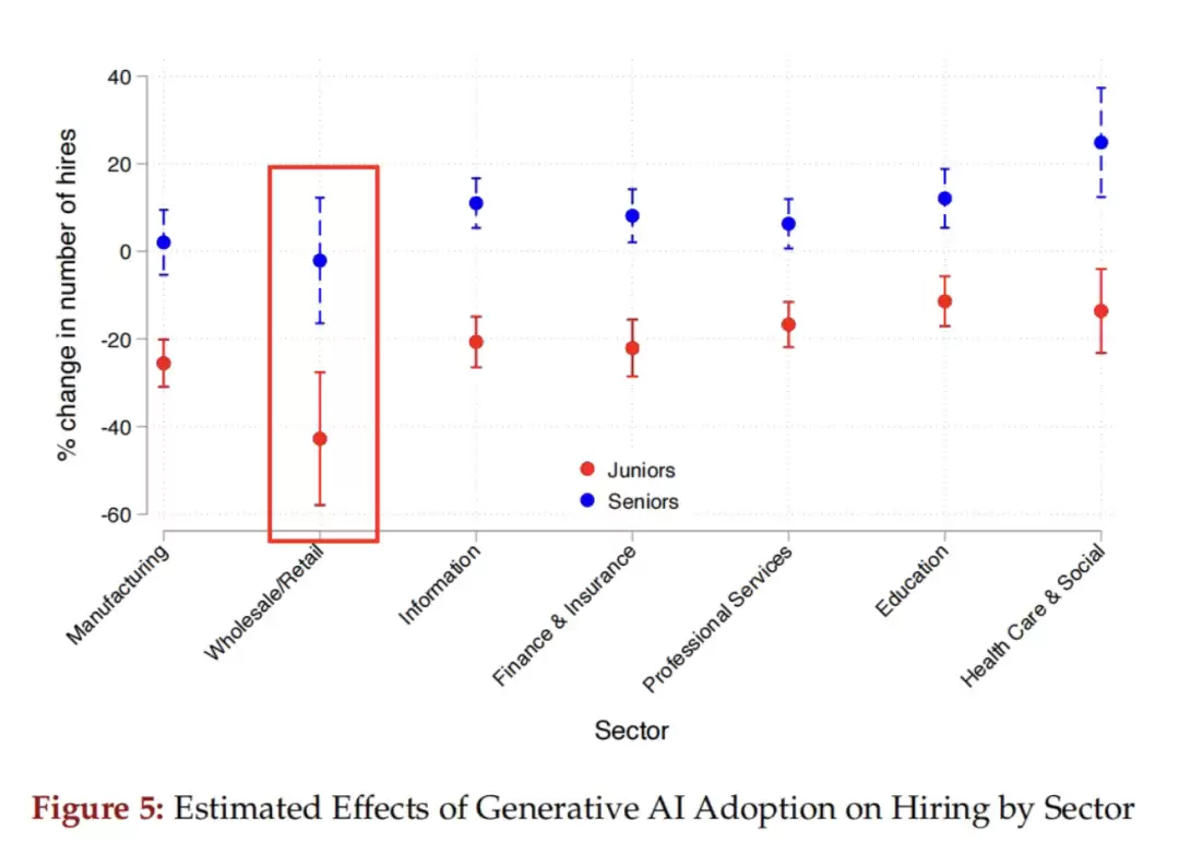 但最惨的其实是批发零售业。因为这个行业的初级岗位,大多是文员、客服、导购,正好是AI最擅长替代的。结果就是,拥抱AI的零售公司,比不用AI的同行,每季度少招40%的新人,招聘直接砍半。