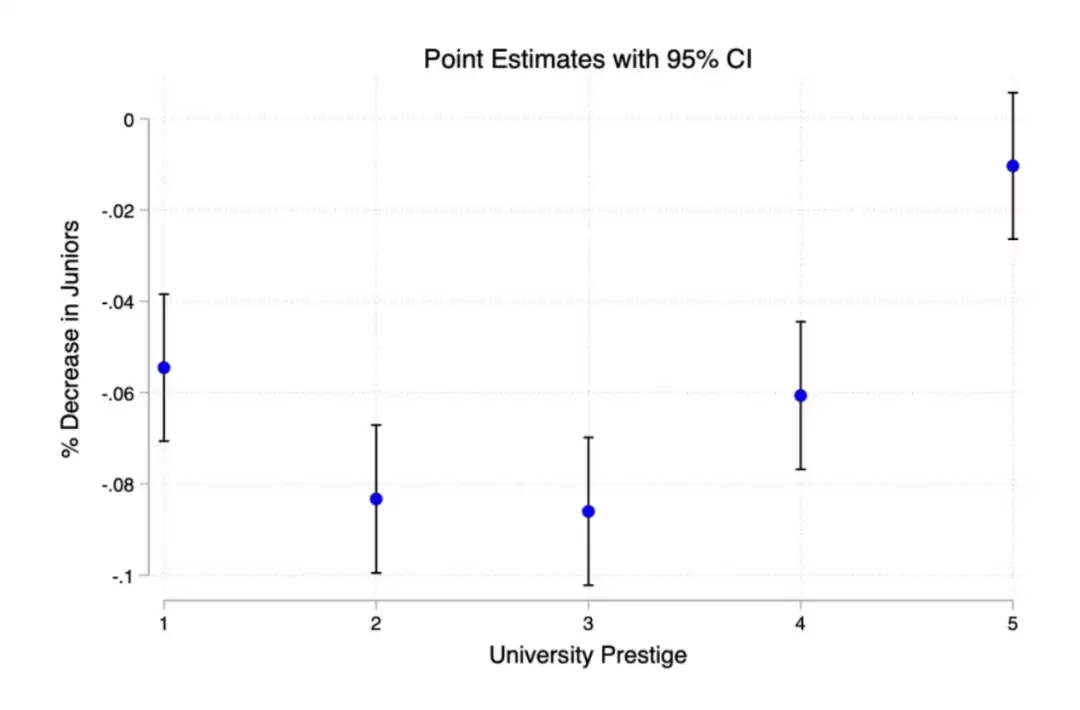 在研究里,作者们把毕业院校分成Tier 1到Tier 5五个档次,结果出来一条“U型曲线”。顶尖名校(Tier 1)影响不大,普通地方学校(Tier 5)也还好,真正被打击最狠的,是Tier 2和Tier 3,也就是那些“不算顶尖,但也很不错”的学校。